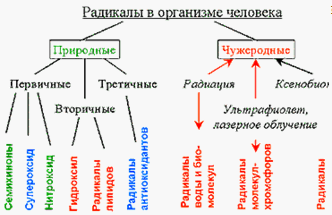 Все радикалы, образующиеся в человеческом организме, можно разделить на природные и чужеродные. В свою очередь природные радикалы можно разделить на первичные, вторичные и третичные (См. схему на рис. 4).