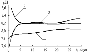 Рис. 2.1. Изменение рН в пробах речной воды: 1 — речная вода без воздействий, 2 — кипяченая речная вода, 3 — кипяченая речная вода с добавлением