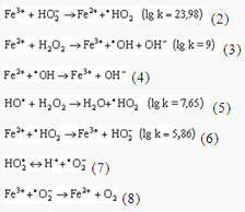 В качестве восстановителей и одновременно катализаторов процесса могут выступать металлы переменной валентности, в том числе железо (общая концентрация ионов железа в речной воде составляет 0,2-1,2 мг/л). Полная схема катализа ионами железа распада перекиси водорода представлена ниже. Логарифмы скоростей реакций приведены для температуры 298 К.