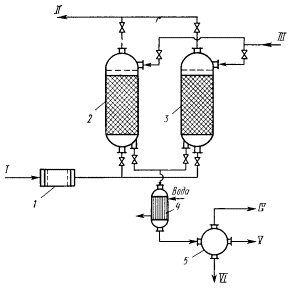 1 — фильтр; 2, 3 — адсорберы; 4 — конденсатор; 5 — сепаратор; І — очищаемый газ; ІІ — очищенный газ; ІІІ — водяной пар; IV — неконденсируе.уые пары; V — сконденсированный адсорбтив в хранилище; VI — водный конденсат
