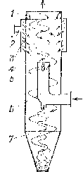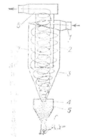 Запыленный воздух подводится через патрубок 6, расположенный коаксиально с цилиндрическим корпусом аппарата 4. В конце патрубка установлены розетка или винт 5 для закручивания воздушного потока, который, поднимаясь винтообразно, отбрасывает частицы пыли к стенкам аппарата. В верхней части корпуса через патрубок 2 и тангенциальные сопла 3, наклоненные вниз, подается вторичный поток. Струи воздуха, выходящие из сопел с большими скоростями в одном направлении с основным потоком, интенсифицируют его вращение и одновременно создают около стенок аппарата винтовое движение, направленное вниз. Опускающийся наружный вихрь отводит отброшенные на периферию частицы пыли в нижнюю часть 7 корпуса аппарата, где они окончательно выделяются из вращающеюся потока. Вверху цилиндрического корпуса установлена диафрагма с целью разделения восходящего и нисходящего вихрей [4].