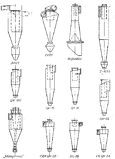 В отечественной пылеочистной технике применяются различные типы циклонов одного назначения (рис. 6). Причиной такого чрезмерного разнообразия является то обстоятельство, что разработкой этих устройств на протяжении десятилетии занималось множество организаций, не координировавших свою деятельность.