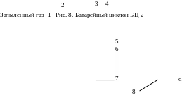 Запыленный газ через патрубок 1 входит в клиновидную форкамеру 2 и, проходя через пространство между выхлопными трубами 5, поступает в закручивающие устройства, расположенные в кольцевой щели циклонных элементов 6. Выделившаяся пыль поступает в пылесборный бункер 7. Очищенный газ через выхлопные трубы 5 проходит в сборную камеру 4 и выходит из аппарата. В крышке аппарата установлены патрубки с взрывными клапанами 3, причем численное значение их общей площади (в м2) должно составлять не менее 5% численного значения объема аппарата (в м2). Весь аппарат разделен перегородкой 9 на две параллельно работающие секции, чтобы при понижении расхода воздуха одну можно было отключить.