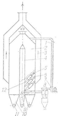 от пыли, двигается по направлению снизу вверх и удаляется через коаксиально расположенную выхлопную трубу 7 и улитку 8 из циклона. Небольшая часть этого потока, в котором сконцентрирована основная масса выделяющейся пыли, поступает через пылеотводящее отверстие 4 в бункер 5, где происходит окончательное осаждение частиц. Эта часть потока, освободившись от сконцентрированных в нем частиц, выходит из бункера через центральную зону того же пылеотводящего отверстия 4. Уловленная пыль выгружается из бункера 5 через пылеспускной патрубок и разгрузочное устройство 6, которое в период работы циклона должно обеспечивать полную герметичность.