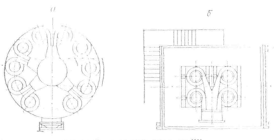 С увеличением диаметра циклона при постоянной тангенциальной скорости потока центробежная сила, воздействующая на пылевые частицы, уменьшается и эффективность пылеулавливания снижается. Кроме того, установка одного высокопроизводительного циклона вызывает затруднения при его размещении вследствие его большой высоты. В связи с этим в технике пылеулавливания широкое применение нашли групповые (рис. 7) и батарейные циклоны.