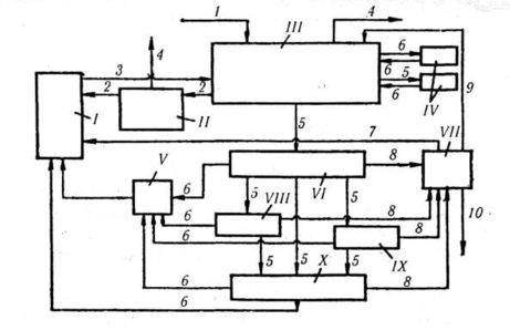 І - вузол оборотного водопостачання; ІІ - вузол охолодження умовно чистої води; ІІІ - технологічні установки; ІV - механічне очищення; V - вузол додаткового очищення; VІ - механічне очищення; VІІ - вузол підготовки відходів; VІІІ - фізико-хімічне очищення; ІX- хімічне очищення; X - біологічне очищення; 1 - лінія додаткової води; 2 - оборотна охолоджувана вода (умовно чиста); 3 - лінія чистої води, що повертається в технологічні установки; 4 - утрати води; 5 - лінії стічних вод; 6 - лінії очищених стічних вод; 7 - лінія подачі чистої води з вузла підготовки відходів; 8 - лінії відводу з очисних пристроїв відходів, що містять воду; 9 - лінія повернення корисних відходів у технологічні установки; 10 - лінія відводу відходів на знищення