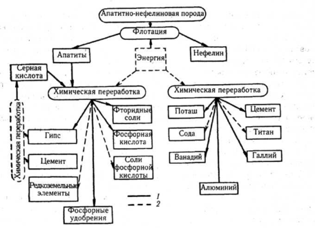Як приклад комплексного використання сировини можна привести схему переробки апатито-нефелиновой породи (мал. 6).