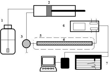 Насос (2) предназначен для создания постоянного потока растворителя. Его конструкция определяется, прежде всего, рабочим давлением в системе. Для работы в диапазоне 10-500 МПа используются насосы плунжерного (шприцевого), либо пистонного типов. Недостатком первых является необходимость периодических остановок для заполнения элюентом, а вторых - большая сложность конструкции и, как следствие, высокая цена. Для простых систем с невысокими рабочими давлениями 1-5 МПа с успехом применяют недорогие перистальтические насосы, но так как при этом трудно добиться постоянства давления и скорости потока, их использование ограничено препаративными задачами.