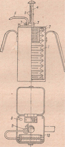 Рис. 2. Газоанализатор УГ-2 (продольный разрез и вид сверху): 1-резиновый сильфон; 2-пружииа в сжатом состоянии; 3-неподвижная втулка; 4-шток; 5-канавка с двумя углублениями; 6-отводная резиновая трубка; 7-стопор; 8-отверстие для хранения штока; 9-отверстие для штуцера; 10-подставка со шкалами.