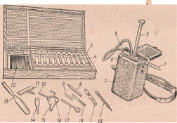 Рис. 1. Газоанализатор УГ-2 в рабочем состоянии с комплектом принадлежностей и футляром: 1-фильтрующий патрон; 2-шток; 3-футляр для принадлежностей; 4-ампулы с индикаторным порошком; 5-индикаториая трубка; б - шкала; 7- воздухозаборное устройство; 8 -индикаторная трубка с колпачками из сургуча; 9-малая трубка для продувания патрона; 10-штырек; 11-шаблон для изготовления пыжей; 12-металлнческая коробка для хранения индикаторных трубок и патронов; 13- пустая запасная ампула; 14- воронка с оттянутым концом; l5-воронка; 16-пыж; 17-стержень; 18-отработанная индикаторная трубка; 19-термометр
