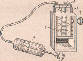 Рис. 4. Универсальный газоопределитель системы Перегуд: 1- подъемная рамка; 2-микропоглотительный прибор; 3-стандартная шкала; 4-винт подъемного устройства; 5-смотровые отверстия; 6-шприц.