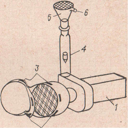 Аппарат (рис. 5) состоит из мотора с центрифужным вентилятором 1, дающим возможность просасывать воздух со скоростью 100 л/мин, ротаметра 4, специального патрона 3 для фильтра с крышкой. На боковой стороне патрона и крышки имеются отверстия 2 для регулировки скорости струи и поступающего воздуха. В держатель закладывают 20 г импрегнированной ваты и шерсть для удаления мешающих примесей.