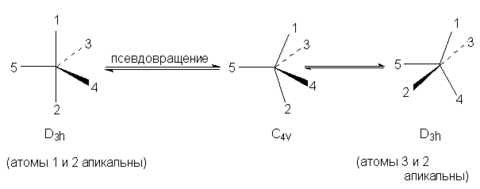 Псевдовращение происходит потому, что энергетическая разница между конфигурациями D3h и C4v в пентакоординационных соединениях фосфора очень невелика.
