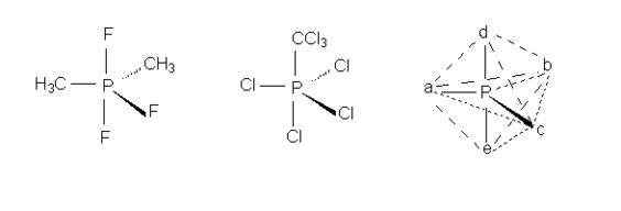 Пять заместителей занимают стереохимически неодинаковое положение: три из них (а, b и с в формуле LXV) называют экваториальными, а два (d и е) - апикальными. Интересно, что молекула LXV с пятью разными заместителями у атома фосфора, в принципе, может существовать в виде 20 хиральных изомеров, составляющих 10 пар энантиомеров. Если два заместителя одинаковы, число изомеров сокращается до 10, среди которых две пары будут энантиомерами.