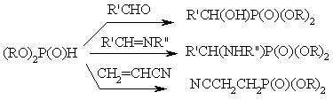 Эти же соединения в условиях гетеролитических реакций присоединяются по связям С=O, С=N, С=S, С=C c образованием разнообразных функционализированных ФОС:
