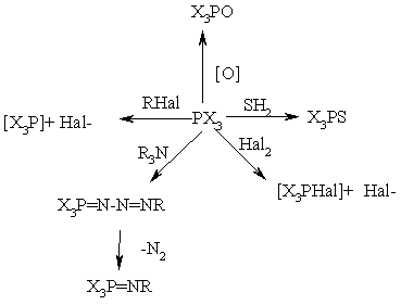 4. Важнейшие реакции производных трехвалентного Р. Эти соединения легко окисляются, присоединяют атомы S, Se, Te, Hal, иминируются, алкилируются: