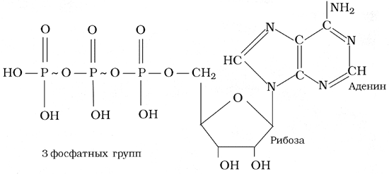 Молекула АТФ - это один своеобразный нуклеотид, который, как и другие нуклеотиды, состоит из трех компонентов: азотистого основания - аденина, углевода - рибозы, но вместо одного содержит три остатка молекул фосфорной кислоты. Связи, обозначенные значком ~, богаты энергией и называются макроэргическими. Каждая молекула АТФ содержит две макроэргические связи.