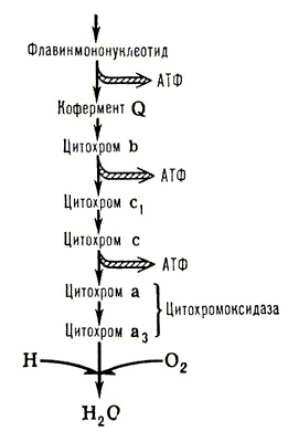 Перенос электронов по цепи завершается восстановлением О2 с помощью сложного ферментного комплекса — цитохромоксидазы. Т. о., процесс окисления субстрата кислородом опосредован серией окислительно-восстановительных реакций; в результате каждой из этих реакций энергия, запасённая в молекуле окисляемого субстрата, освобождается небольшими порциями, что позволяет клетке использовать её более полно. Утилизация высвобождаемой энергии происходит в т. н. пунктах энергетического сопряжения. Синтез АТФ из АДФ и фосфата осуществляется ферментным комплексом АТФ-синтетазой (который может катализировать и обратную реакцию — расщепление АТФ).