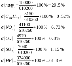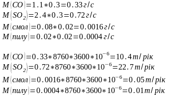 Якщо середній експлуатаційний коефіцієнт очистки для оксиду вуглецю та сірчистого ангідриду 70 %, то кількість викидаємих з димаря забруднюючих речовин складає 30 % від кількості утворившихся під час технологічного процесу. Відповідно для смол та пилу, при ступені очистки 98 % з димаря викидається 2 % від утвореної кількості. Отож секундний та річний фактичний викид складає: