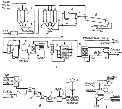 Технологический процесс (рис. 4, а) включает стадии сушки гипса, размола добавок и подготовки сырья для обжига (сухой способ). В процессе обжига шихты при температуре до 1400–1450 °С идет восстановление сульфата кальция коксом и образование клинкера. Присутствующие в шихте песок и глина способствуют интенсификации протекающей при обжиге конверсии сульфата кальция. В качестве топлива для обжиговой печи используют мазут, газ или распыленный уголь. Получающийся клинкер размалывают.