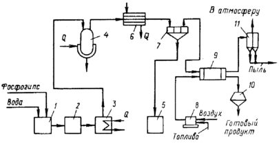 Рис. 5. Схема опытно-промышленной установки переработки гипсовых отходов: 1 – смеситель; 2 – емкость-накопитель; 3 – расходная емкость; 4 – автоклав; 5 – сборник фильтрата; 6 – теплообменник; 7 – ленточный вакуум-фильтр; в-топка; 9 – сушильный барабан; 10 – бункер; 11 – циклон