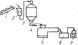 Рис. 14. Принципиальная схема переработки отходов пластмасс методом экструзии: 1 – конвейер с отходами; 2 – измельчитель; 3 – бункер-смеситель; 4 – магнитный желоб; 5 – экструдер; 6 – охлаждающая ванна; 7 – гранулятор