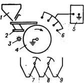 Рис. 11. Принципиальная схема электрического сепаратора с коронирующей системой: 1 – бункер; 2 – вибропитатель; 3 – щетка; 4 – вращающийся заземленный электрод (барабан); 5 – источник высокого напряжения; 6 – коронирующие электроды; 7–9 – бункеры.