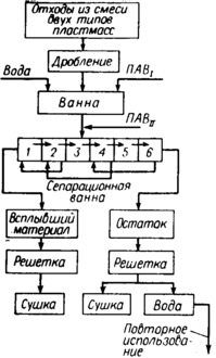 На рис. 13 представлена принципиальная схема флотационной сепарации, наиболее пригодная для разделения отходов из смеси двух типов пластмасс, одним из которых является ПВХ. Для более полного разделения смеси отходов в воду добавляют ПАВ, которые придают каждому из компонентов смеси определенную гидрофобность и гидрофильность. Так, для выделения ПВХ можно использовать водные растворы сульфоната двухосновного алифатического эфира, динафталинсульфоната, полиоксиэтиленсульфата, простого полиоксиэтиленового эфира и других ПАВ.