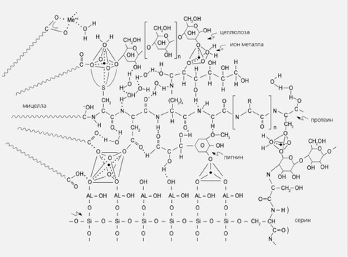 Рисунок 5- Один из вариантов нахождения тяжелых металлов (черные точки) в комплексе гуминовой кислоты с высокодисперсным глинистым минералом [5]