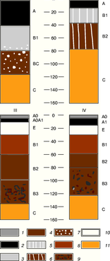I - чернозем типичный, II - солонец, III - подзол, IV - дерново-подзолистая; 1 - АО - подстилка, 2 - А1 - перегнойно-аккумулятивный горизонт, 3 - В1- переходный горизонт в черноземах, 4,8, 9 - В2, В1, ВЗ - иллювиальные горизонты подзолистых почв, 5- В1 - иллювиальный солонцовый горизонт, 6 - В2 - переходный горизонт солонца, 7- ВС - переходный карбонат карбонатный горизонт чернозема, 10 - Е - элювиальный горизонт, 11 -С- материнская порода [2].