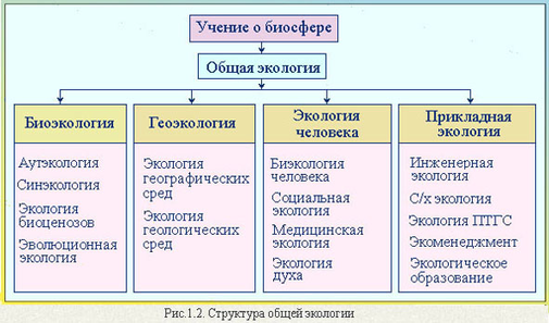 В більшу узагальненому значенні, під екологією розуміється область знань, розглядаючи сукупність природних об'єктів, явищ і процесів, по відношенню до об'єкту або суб'єкта, що приймається за центральний об'єкт цієї сукупності. Цим центральним об'єктом може бути той або інший вид рослини або тварини, популяція (співтовариство організмів одного вигляду, що мешкають в межах єдиного ареалу) або людина, як один з видів живих істот мешкають на Землі і при цьому надаючи дію на її природу незрівнянно більше, ніж будь-який інший вигляд або популяція, або яке те виробництво.