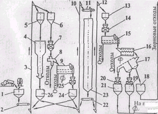 На рис. 1 дана аппаратурно-технологическая схема приемки, очистки, хранения и сортирования ячменя. Зерно, доставляемое на завод автомобильным и железнодорожным транспортом, поступает в приемный бункер 1, откуда ленточным транспортером 2 и элеватором (норией) 3 подается в промежуточный бункер 6. Из него зерно через автоматические весы 7 и магнитный сепаратор 8 поступает в воздушно-ситовый сепаратор 9, где и проводится первичная очистка. Для очистки воздуха при первичной очистке в помещении устанавливается рукавный фильтр. Очищенное и взвешенное на весах 25 зерно накапливается в бункере 24 и затем элеватором 10 и транспортером 11 подается в силосы 23 на хранение.