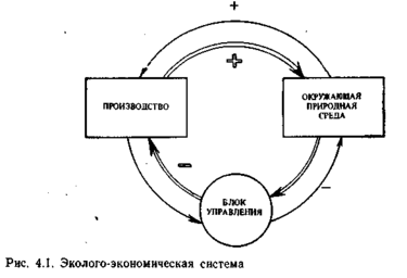 Решать подобные проблемы предлагается на основе гармонизации отношений природных и технических компонентов путем создания и эксплуатации так называемых природно-технических или геотехнических систем, которые в свете экологического подхода правильнее рассматривать в качестве эколого - экономических. Такая система - это совокупность технических устройств и взаимодействующих с ними элементов природной среды, которая в ходе совместного функционирования обеспечивает, сводной стороны, высокие производственные и прочие целевые показатели, а с другой - поддержание в зоне своего влияния благоприятной экологической обстановки, максимально возможное в каждом конкретном случае сохранение и воспроизводство естественных ресурсов. Производство воздействует на природные системы (положительная обратная связь). Эти воздействия (знак «плюс»), т.е. фактически управление, могут проявляться в извлечении природных ресурсов, размещении производственных отходов (загрязнении) и т.п. В свою очередь, окружающая среда также может влиять на предприятие (рис. 1). Подобные воздействия, так или иначе, могут привести к разрушению управляемой подсистемы, а, следовательно, и всей эколого-экономической системы. Чтобы этого не происходило, необходимы компенсационные ответы со стороны управляемой подсистемы по отношению к управляющей через каналы отрицательной обратной связи (знак «минус»).