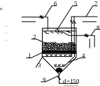 1 – колосниковая решетка; 2 – коагулянт; 3, 4 – верхняя и нижняя распределительная система для подачи сжатого воздуха; 5 – поплавок; 6 – подача воды для растворения коагулянта (подогретой до