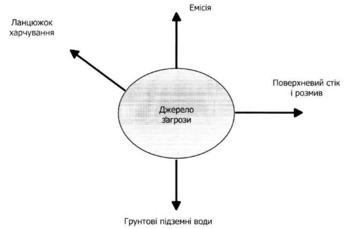 В нашому прикладі ДЖЕРЕЛО ЗАГРОЗИ характеризується природою й інтенсивністю викиду хімічних речовин на даній ділянці місцевості. ШЛЯХ ПРОХОДЖЕННЯ - це ряд явищ міграції забруднюючих речовин і він є вектором. Взагалі існує безліч шляхів проходження між джерелом і об'єктом впливу і чим довше вони вилучені один від одного, тим більше ланок у ланцюзі явищ, що утворять шлях проходження, які варто розглядати і більшим є об'єм робити для аналізу екологічного ризику [18].