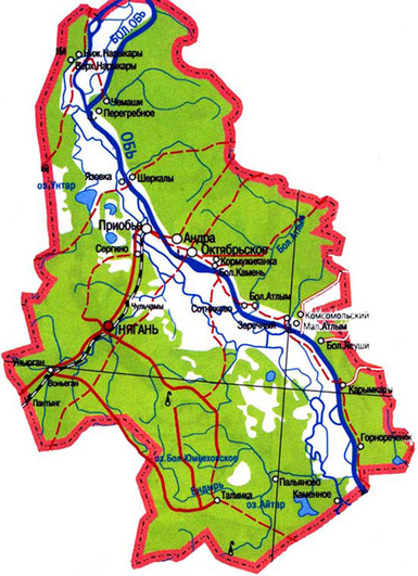Октябрьский район расположен в пределах Западно-Сибирской низменности, по обе стороны нижнего течения реки Обь, с севера на юг район протянулся на 258км, с запада на восток - 166км. http://admhmao.ru/common/oktyabr/Foto/1.jpg