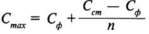 де Сmах - концентрація речовини в максимально забрудненому струмені, г/м3; Сф - концентрація речовини у воді вище випуску стічних вод (фонова концентрація), г/м3; Сст- концентрація речовини в стічній воді, г/м3; n - кратність розведення стічних вод на заданій відстані від випуску.