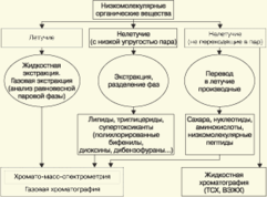 Высокомолекулярные полимерные вещества, присутствующие в водной пробе (гуминовые и фульвиновые кислоты во внешних природных водах, белковые компоненты и нуклеиновые кислоты в плазме крови), определяют методами жидкостной хроматографии - эксклюзионной, тонкослойной и высокоэффективной жидкостной хроматографии (схема 3).