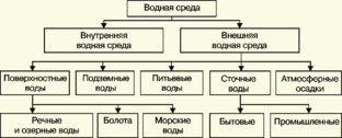 В большинстве случаев термин "водная среда" относят к различным водным объектам, находящимся вне организма человека - к морским и речным водам, иным поверхностным водам суши, подземным водам, промышленным и бытовым стокам, атмосферным осадкам, наконец, к пищевым водам (схема 1). Все эти группы объектов было бы правильнее называть "внешней водной средой".