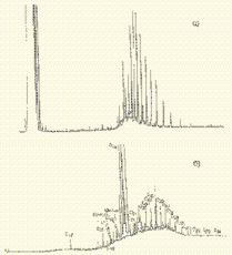 Рис. 1. Типичные хроматограммы нефтяных загрязнений, экстрагированных из воды Таганрогского залива: а) - август 1991 г.; б) - октябрь 1991 г.