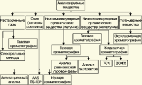 В связи с тем, что в организме человека, как и многих других живых существ, по крайней мере 80% приходится на долю воды, правомерно говорить о "внутренней водной среде" и о соответствующих объектах анализа. Эта категория объектов включает гомогенизаты и экстракты тканей различных органов и биологические жидкости, к числу которых относятся плазма крови, лимфа, слюна, моча, желчь, желудочный сок, спинно-мозговая жидкость и другие (схема 2). Как в первой, так и во второй группе объектов в анализируемых пробах могут присутствовать весьма разнообразные вещества, детальный анализ которых требует применения различных аналитических методов. Так, например, растворенные газы в морских и подземных водах, а также и в крови человека, определяют с помощью спектральных методов и в ряде случаев с помощью газовой хроматографии. Металлы, присутствующие в водных объектах, анализируют с помощью атомной абсорбционной спектроскопии или эмиссионной спектроскопии с индуктивно связанной плазмой. Очень малые следовые примеси многих элементов в водной среде определяют с помощью радиоактивационного анализа, а состав присутствующих в водной среде анионных составляющих анализируют методом ионной хроматографии.