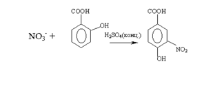 Метод определения нитратов основан на способности салициловой кислоты в присутствии H2SO4 (конц). вступать в реакцию нитрования с образованием нитросалициловой кислоты, которая в щелочной среде образует окрашенную в желтый цвет соль.