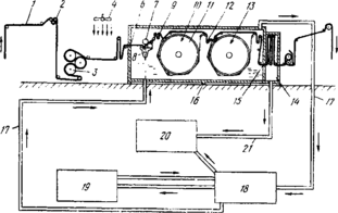 После окончания просушки на втором барабане 13 ткань выходит из камеры 16 через выходной затвор 15. Это устройство аналогично 6 и обеспечивает перепад давлений, исключающий утечку аммиака.