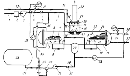 Скорость подачи свежей воды по линии 13 (через жиклер 20) регулируется вентилем 14, управляемым уровнемером 36, связанным с холодильником 23.