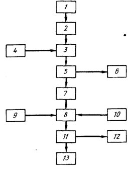 Затем реакционную смесь фильтруют иа фильтре 5, либо воду 6 удаляют каким-нибудь другим способом и остаток подают в сушилку 7, температура в которой составляет 150—200 °С и где происходит практически полное удаление остаточной влаги. Сухой продукт подают в смеситель 8, представляющий собой обычный смесительный аппарат, где происходит смешивание с углеродсодержащим восстановителем 9 и флюсом 10, состоящим из КС1 и NaCl.