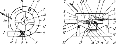 Спиральный желоб / имеет вертикальные стенки 2 и дно 10. Желоб / укреплен на раме 11, которая поддерживается пружинами 12 и основаниями 13. На раме 11 также укреплен мотор 14 с вертикальной осью 16, с которой соединены два эксцентрических груза 15. При работе мотора 14 грузы 15 придают круговую вибрацию желобу /. Дно желоба имеет равномерный наклон за исключением короткого крутого участка 8 у верхнего конца желоба. С этого крутого участка сырье попадает в выходной желоб 6. Через два отверстия 9, закрытые ситом с маленькими отверстиями, активный материал—в сухом или мокром виде — выходит из желоба. По желобам 17 активный материал попадает в поддон 18, в котором его собирают для повторного использования. Во втором поддоне 19 собирают частицы пластин, выходящие через выходной конец 3 желоба 6.