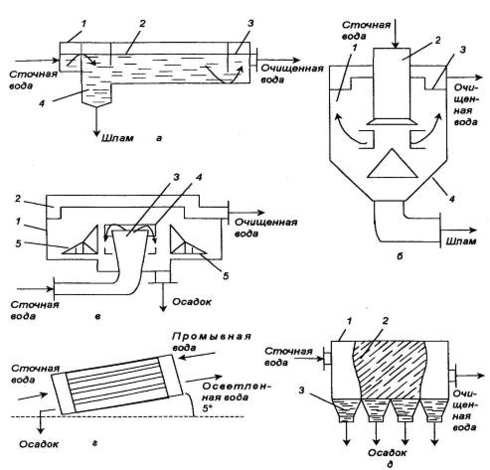 Пластинчатые отстойники. Они имеют в корпусе ряд параллельно установленных наклонных пластин. Вода движется между пластинами, а осадок сползает вниз в шламоприемник. Могут быть прямоточные отстойники, в которых направление движения воды и осадка совпадают; противоточные — вода и осадок движутся навстречу друг другу; перекрестные, в которых вода движется перпендикулярно движению осадка. Наиболее распространены противоточные отстойники.