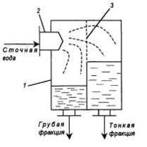 Для разделения взвешенных частиц на фракции могут быть использованы фракционаторы, основной частью которых является вертикальная сетка, разделяющая емкость на две части (рисунок 2). Диаметр отверстий сетки 60-100 мкм. Сточная вода через сопло поступает внутрь фракционатора и делится на грубую и тонкую фракции. При разделении 50-80% взвешенных частиц остается в грубой фракции.