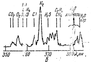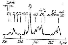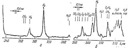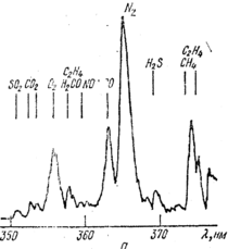 В дальнейшем источниками возбуждения служили излучение с азотного лазера и второй гармоники лазера на кристалле Nd3+YAG ( = 532,0 нм). Последняя система положена в основу промышленного образца прибора. Разработанные лидары были использованы для проведения физических исследований атмосферы и, в частности, для измерения концентрации посторонних веществ. Удалось отождествить в дыму и выхлопных газах автомобиля повышенное содержание СО2, и СО (0,11 и 0,43 %), а также SО2, С2Н4, Н2СО, NО, Н2, С3Н4, СН4, паров воды (рис. 9).