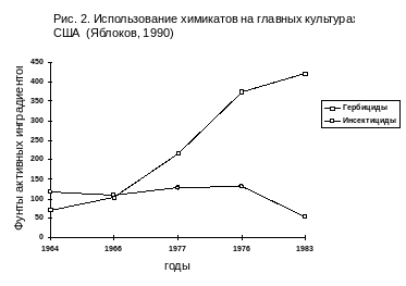 Немногим лучше обстоит дело и с сорными растениями, в популяциях которых сравнительно недавно обнаружились экотипы, устойчивые к гербицидам. В итоге, видов-засорителей стало меньше, но экземпляров засорителей больше. Примерно также обстоит дело с использованием фунгицидов. На рис. 3 можно видеть количественную динамику применения химикатов за последние годы. Примечательно, что применение гербицидов растет быстрее по сравнению с инсектицидами, что отражает большую эффективность их использования и появление целого ряда малотоксичных и быстроразлагающихся в почве гербицидов, заменяющих агротехнические приемы при минимальной обработке почвы. После осознания бессмысленности дальнейшего наращивания применения химических средств борьбы с насекомыми резко упала роль инсектицидов.